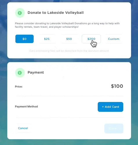 A donation option on your registration form is an easy fundraising idea. This makes it easy for family members to contribute during sign-up and encourages them to support your volleyball team from the beginning.